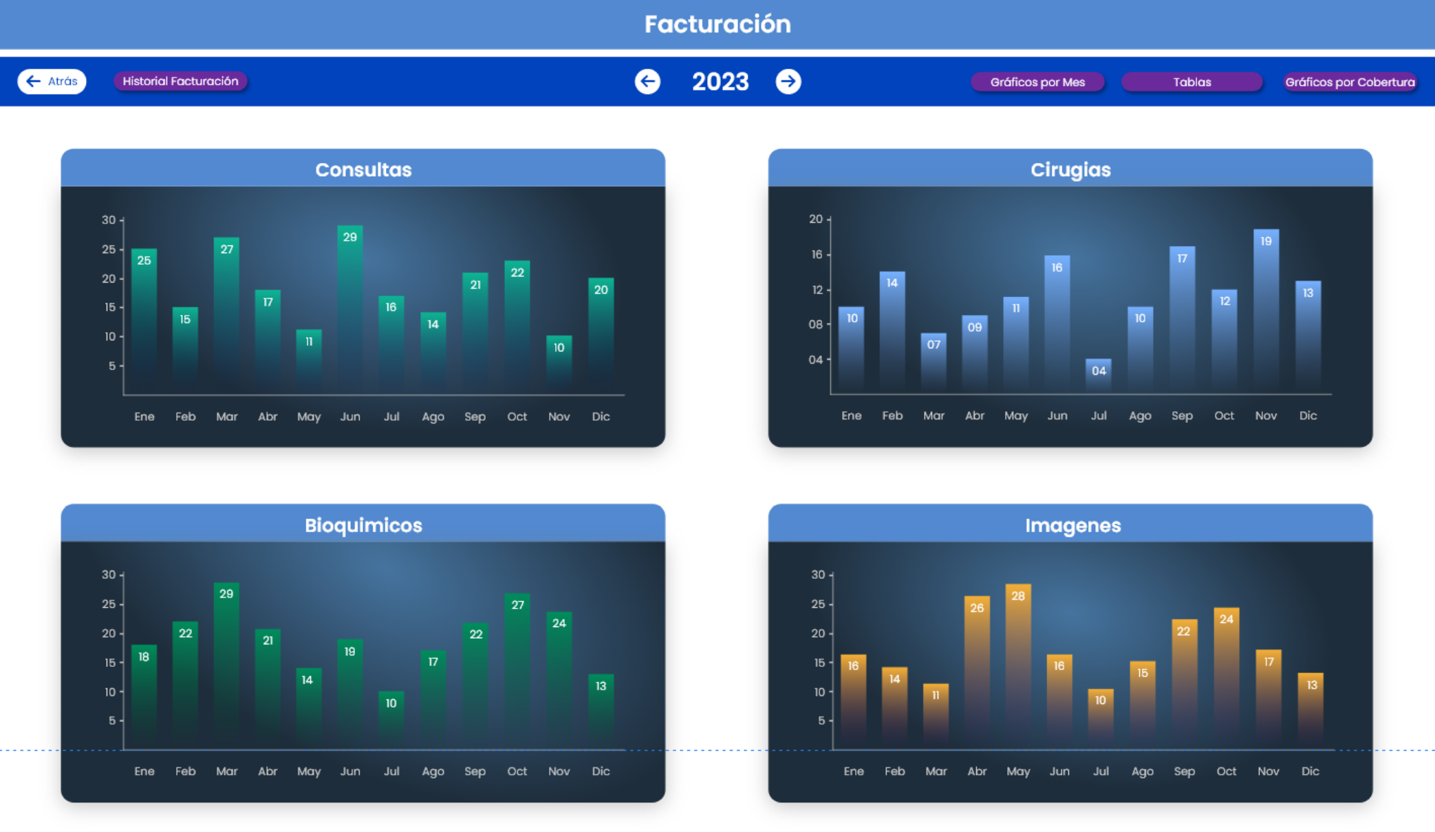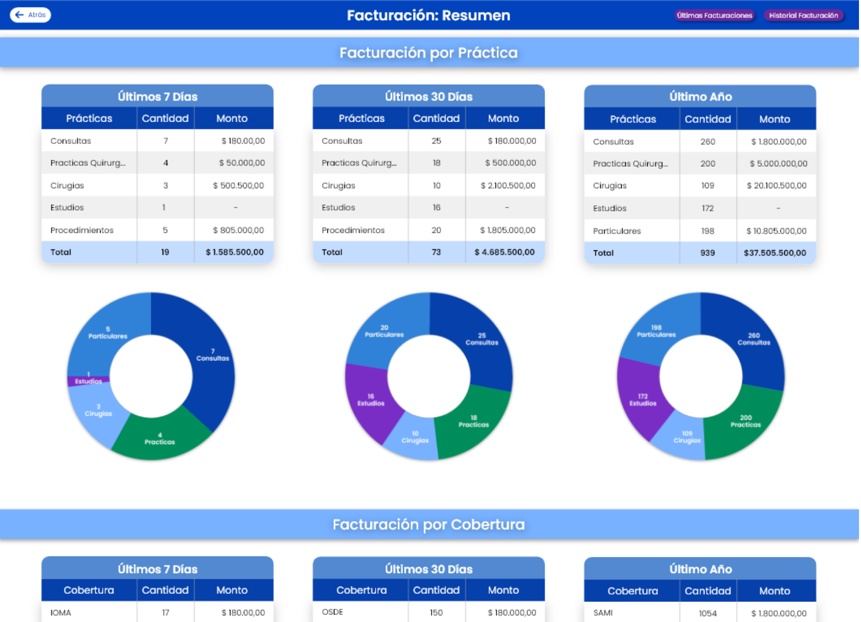 La nueva funcionalidad Facturación permite a los usuarios llevar un estricto control semanal, mensual y anual de todos sus actos profesionales facturables, Consultas, Cirugías, Estudios, Procedimientos, Practicas, etc.
