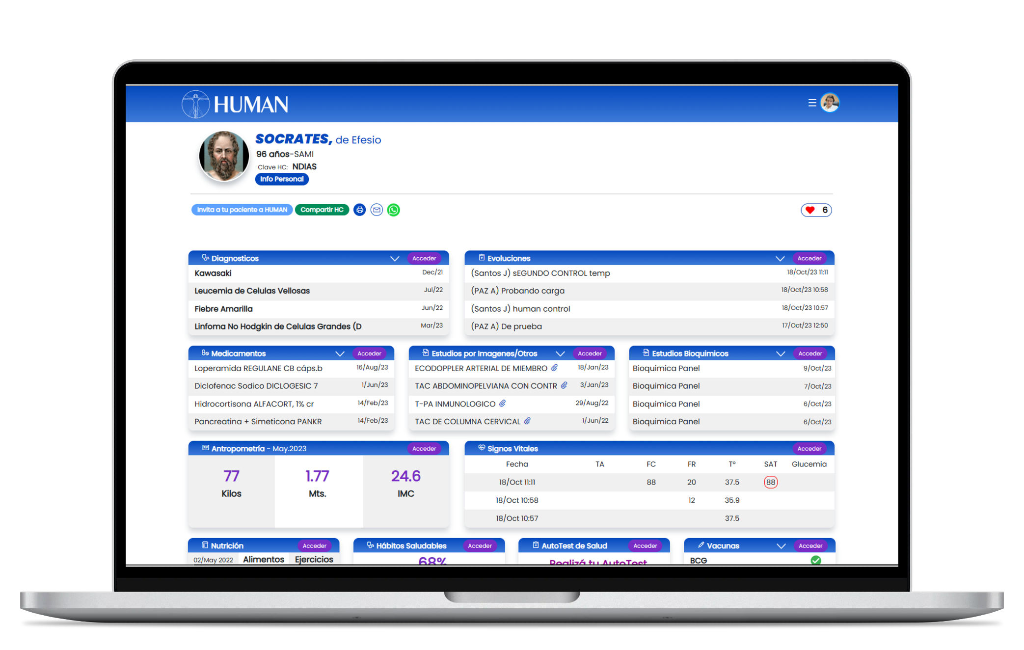 El Dr Sócrates por su formación científica, apuesta a la innovación tecnológica que aporte beneficios a sus pacientes. Por esa razón, utiliza HUMAN SALUD HISTORIA CLINICA, un sistema novedoso y revolucionario para gestionar la salud de sus pacientes. HUMAN HISTORIA CLINICA, permite algo UNICO: el paciente y su equipo de profesionales que lo asisten se mantienen comunicados ONLINE, en tiempo real. Además HUMAN HISTORIA CLINICA le brinda al paciente la posibilidad de tener SIEMPRE su propia Historia Clínica, en su celular a través de una app HUMAN SALUD - Apple Store y HUMAN SALUD - ANDROID